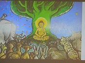 12月8日は、お釈迦さまが真理をさとられた「成道(じょうどう)の日」です。「明星(みょうじょう)」は、お釈迦さまがさとりをひらかれる機縁となった明けの明星をさします。 お釈迦さまは、人のもつ様々な苦しみを取り除く道を求め、29歳で出家されました。そして6年間、あらゆる苦行を続けましたが、苦しみの修行でも、怠惰な生き方でもその道を解き明かすことが出来ないと確信され、菩提樹の下で座禅を続けました。ある朝、明けの明星を仰ぎ、その輝きを機縁にさとりをひらかれました。これを「成道」といいます。標榜の詩は「お釈迦さまのおさとりは、その後、世の人々に尊ばれ、世の中を照らす教えの光となって、天地に充ち満ちています。」という意味です。 お釈迦さまがさとられた内容は、「縁起の法」といい、「この世に存在する現象は、様々な原因や条件によって起こり、このもろもろの現象の生起消滅の法則を縁起」と言います。そして、お釈迦さまは、人々の苦しみの原因を取り除くには、正しい行動を繰り返すことによって解決できると確信されました。お釈迦さまは「明けの明星の輝く中で、自分も大地も生きとし生けるすべてのものが同時にさとりを開いた」と説かれます。大地の総てのものが「縁起の法」の中に行き、それを自覚して学び、そのあるべき姿で行じていくことを示されました。