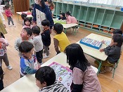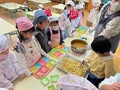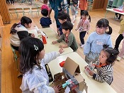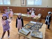 本日、ひかり幼稚園では「たのしみ会」を行いました。年長児(月組3クラス)の子どもたちがクラスごとに出店して、年中児や年少児の子どもたちを楽しませてくれました。月1組は園の畑で収穫したサツマイモの上にピザの具材をトッピングした「サツマイモピザ」屋さん、2組はサツマイモをスティックにしてカレーホイップを付けた「カレーポテト」屋さん、3組は指輪を作って「ゆびわ」屋さんをそれぞれ出店しました。実食しましたが、とても美味しくて子どもたちも美味しく楽しい時間を過ごすことが出来ました。