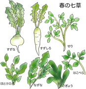 正月7日で、1月7日は「七草がゆ」を頂く家庭も多いことでしょう。「春の七草」は、「セリ、ナズナ、ゴギョウ(母子草)ハコベラ、ホトケノザ(田平子)、スズナ(かぶ)、スズシロ(大根)」の七種。この「七草がゆ」には優れた効用があります。 1)「セリ」は、鉄分が多く含まれているので増血作用が期待できます。2)「ナズナ」は熱を下げる、尿の出をよくするなどの作用があります。3)「ゴギョウ」には、せきやたんを止め、尿の出をよくするなどの作用があります。4)「ハコベラ」は、タンパク質が比較的多く含まれ、ミネラルそのほかの栄養に富んでいます。5)「ホトケノザ」は、体質改善全般。6)「スズナ」には、消化不良の改善。7)「スズシロ」にも、スズナと同じく、消化不良の改善。と、正月のごちそうで疲れた胃をいたわったり、緑の少ない冬の栄養源として、ビタミンを補給する意味があります。