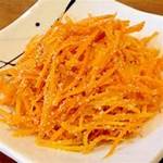 今日の献立は、「ご飯、なめこ汁、にんじんしりしり、鶏唐揚げ」です。「にんじんしりしり」は、にんじんをせん切りにして卵と炒める料理です。にんじん料理「にんじんしりしり」の発祥地は沖縄県で、沖縄県では家庭の味として親しまれています。「しりしり」は、沖縄の方言でせん切り・すりおろすという意味があり、「にんじんせん切り」という意味、そのままです。また、スライサーでせん切りするときの「すりすり」という音が転じて「しりしり」となったという説もありますが、にんじんをせん切りにして使う料理のことを「にんじんしりしり」といいます。にんじんが苦手な児も幼稚園の給食では、お友だちとよく食べ込んでいます。