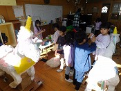 第二ひかり幼稚園では本日、冬休みを前に「たのしみ会」を開催しました。年長児(月組)の子どもたちがクラスごとに制作した恐竜や動物たちを順に見て回りまし
