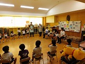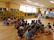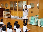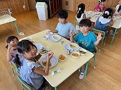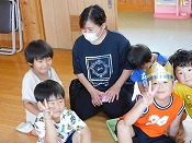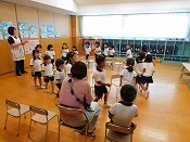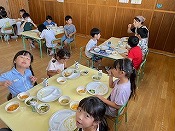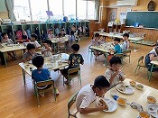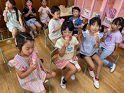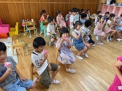 本日、ひかり幼稚園では「7月誕生会」を開催いたしました。冷房の効いた各教室からはゲームや歌などで、子どもたちの歓声が響き、元気いっぱいの「7月誕生会」です。そして誕生会では「誕生会メニュー」の給食も楽しみです。今月は「そぼろご飯、お味噌汁、アジフライ、ミックスサラダ、七夕デザート」を美味しくいただきました。今月の全園児へのプレゼントは「水テッポウ」です。ご家庭で楽しく遊んでください。参加した保護者の皆様には感謝申し上げます。