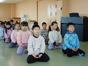 第二ひかり幼稚園の年長児(月組)の子どもたちは「12月座禅会」を修行しました。9月以降は毎回しっかりと取り組む姿が見られていますが、今月も安定して取り組む姿が見られて嬉しく思います。4月から座禅会を通し子どもたちの成長を見ていますが、個々が主体性を持ち確実に成長していることを実感でき嬉しく感じています。来年3月には卒園して就学しますが、小学校でもしっかりと主体的に活動することを期待しています。