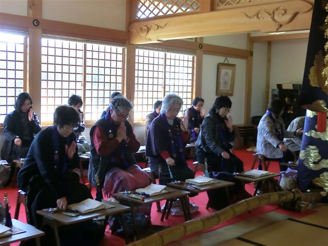 12月8日は、お釈迦さまがお悟りをひらかれたことを讃え祝う「成道会(じょうどうえ)」ですが、全超寺では本日、お釈迦様の成道のお祝いと感謝報恩の『成道会』を梅花講の皆さまと一緒に修行致しました。一同、しばし端座して姿勢と呼吸を整え、心を調えてから、読経諷経し、成道を讃え祝う「成道御和讃」「成道御詠歌」を奉詠申し上げ、大恩教主釈迦牟尼仏にお焼香致しました。毎年、12月には梅花講の皆さまと共に「成道会」を修行していますので、安定したお唱えで「成道会」をしかりと勤めることが出来ました。 4月8日の、お釈迦様の誕生(降誕会)に当たり、梅花講の皆さまと本堂に於いて、読経し御詠歌『釈尊花祭御和讃』を詠えて、誕生を慶祝しました。また、去る3月11日の大震災にて亡くなられた人たちに対し、『追善供養御和讃』の御詠歌をお唱えして、御冥福を祈りました。
